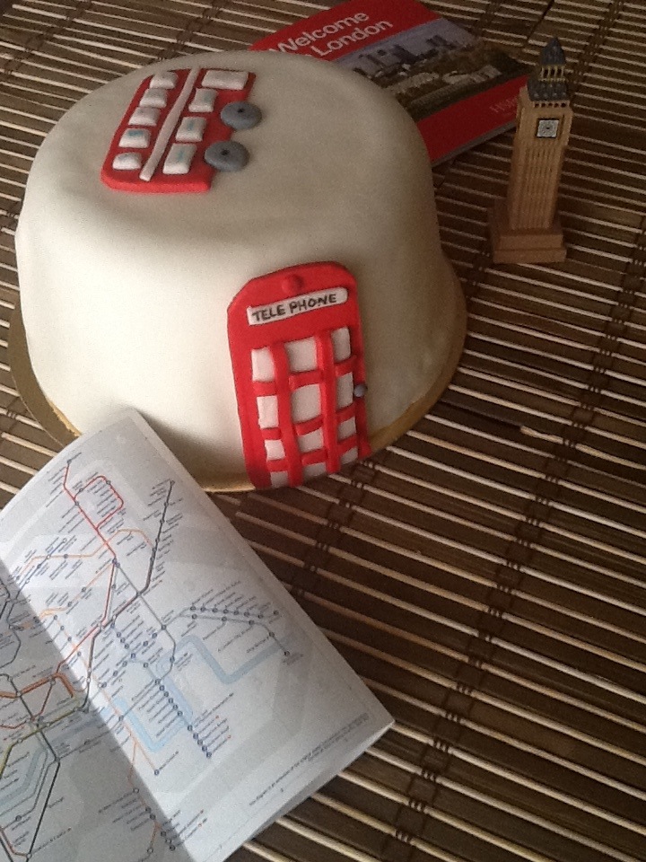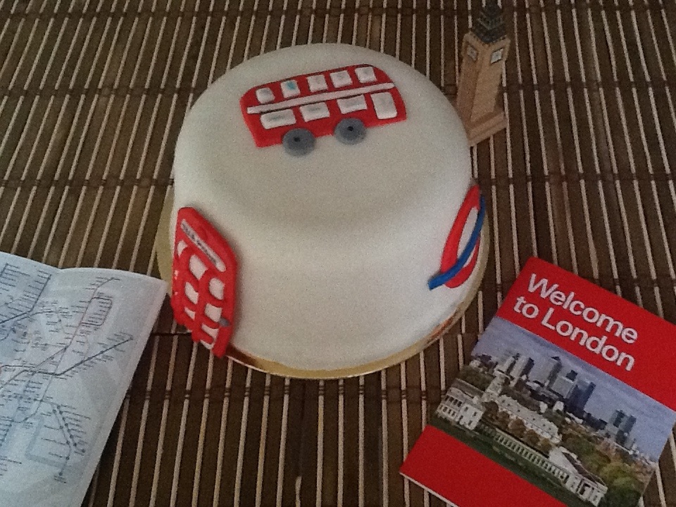 Para entrar en ambiente, hemos preparado una pequeña tartita de bizcocho de chocolate (no podía ser de otra manera) que por cierto parece un bombín y lo hemos rellenado de crema pastelera, y como decoración alguno de los símbolos más representativos de la ciudad que vamos a visitar.